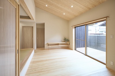今回のお客様はWEBから平野木材を見つけて下さり、事務所に来社、その日のうちに建築中の家を見学して、平野木材の家を気に入って下さりすぐにご依頼をいただきました。その日のお客様の言葉で印象的だったのが・・・「こんなふうに床と天井の木に挟まれながら暮らしたい!」でした。その家のリビングはこんな感じでした。もうすぐこのような気持ちのいい空間での生活が始まります!
