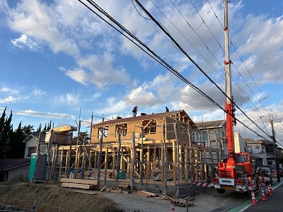 先日、また1軒【平野木材の木の家】の上棟をさせていただきました。初冬のきりっとした寒さの中、大工さんたちの頑張りで夕方には無事に棟が上り立派な骨組みが完成しました。最近晴れが多いです!(^^)